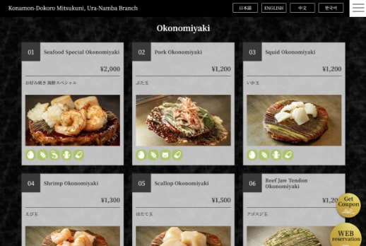 多言語サイトは外国人Welcomeの証。engagePROは、日英中韓の4言語に対応。来店前の情報収集から予約まで、スムーズに完結できる環境を整えています。アレルギー掲載のメニューページをご用意することも可能です。