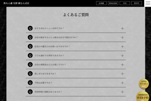 お客様からよくある質問を、複数言語でわかりやすく掲載。来店前の不安を解消し、スムーズな利用へとつなげます。FAQページはSEO対策にも強く、AI検索対策にも良いと言われてますので集客効果の向上にもつながります。