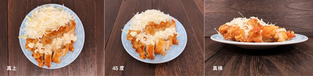 同じ料理を「真上・45度・真横」で撮り比べてみてください。